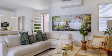 The villa’s tasteful palette of whites, tans, and blues, accented with elegant artwork, creates a warm and inviting atmosphere.